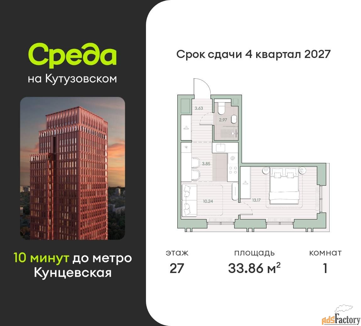 Квартира располагается на 27 этаже 30-этажного дома в ЖК Среда на Кутузовском.