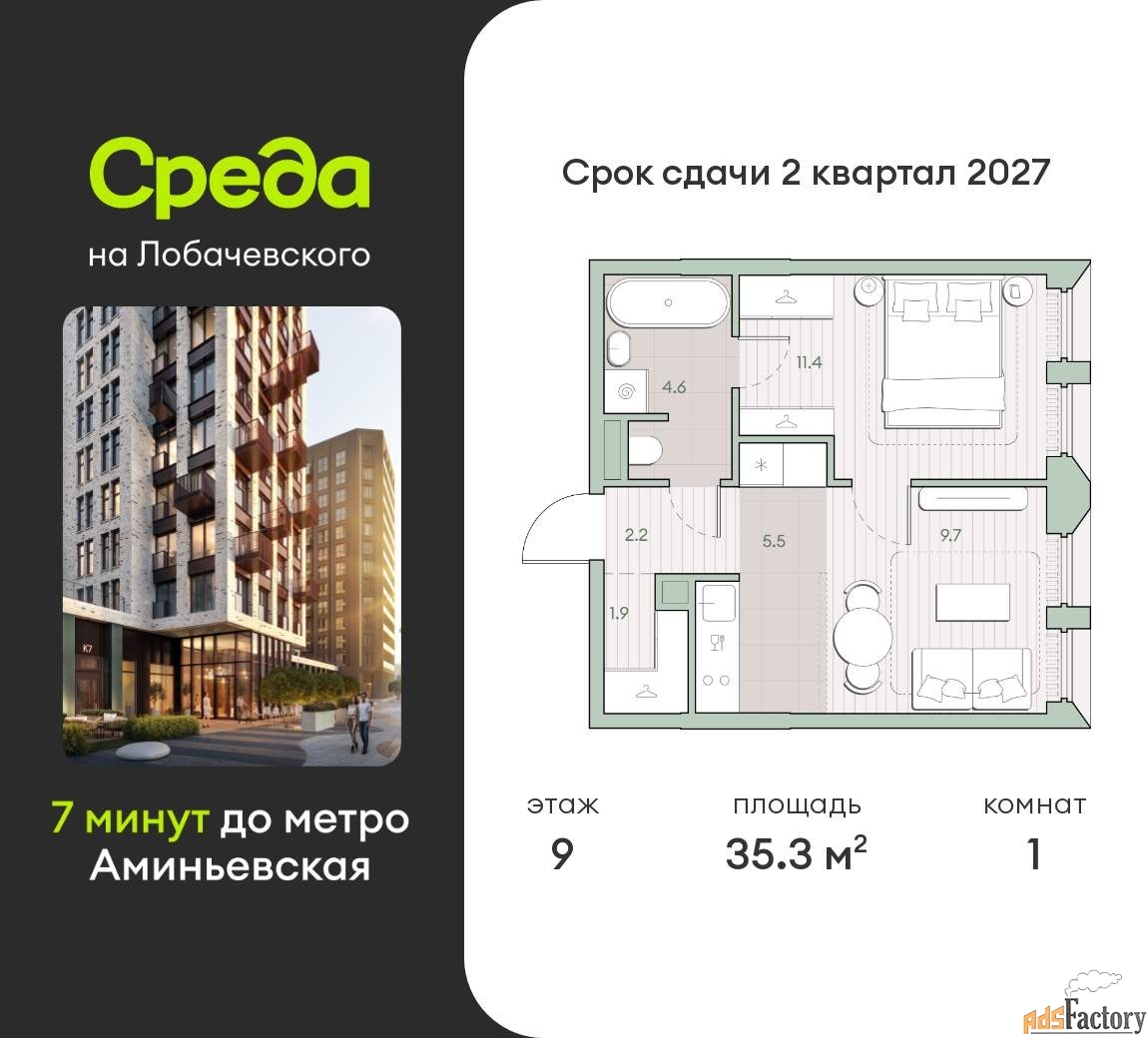 Квартира располагается на 9 этаже 13-этажного дома в ЖК Среда на Лобачевского.