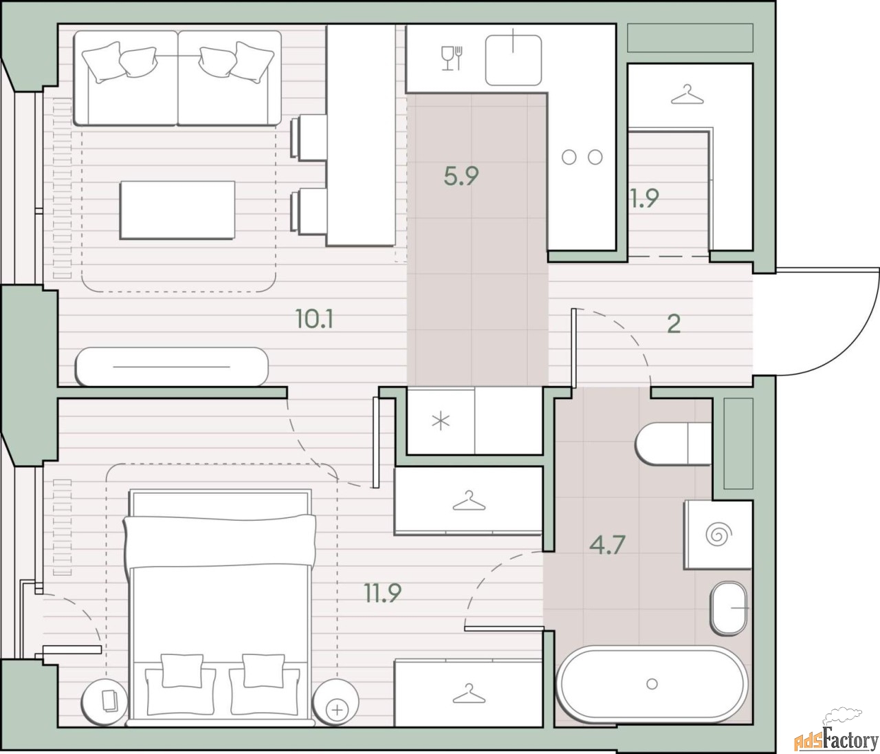 Жилая площадь 22 м2, кухня 5.9 м2, квартира без отделки, комнаты изолированные.