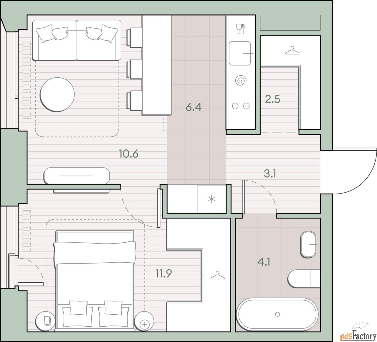 Жилая площадь 22.5 м2, кухня 6.4 м2, предчистовая отделка, комнаты изолированные.