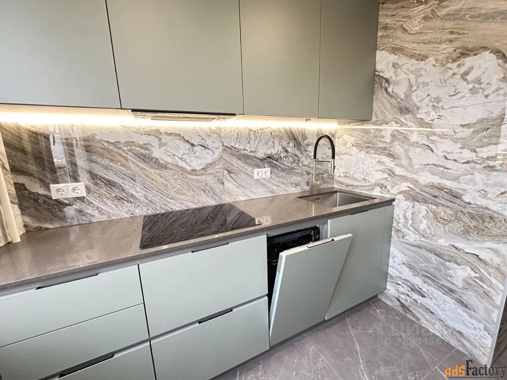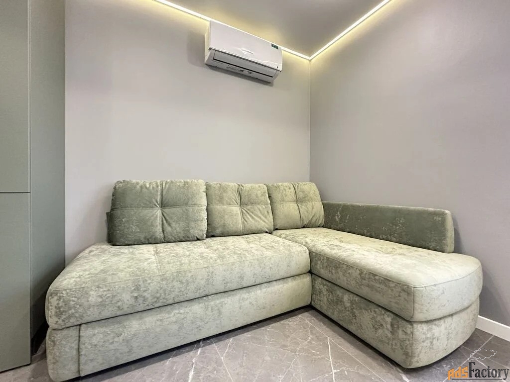 На кухне встроенный кухонный гарнитур, индукционная варочная панель, посудомоечная машина, духовой шкаф, микроволновая печь, двухкамерный холодильник. Удобный угловой диван фирмы Pushe. Фильтры мягкой очистки воды. Кондиционер.