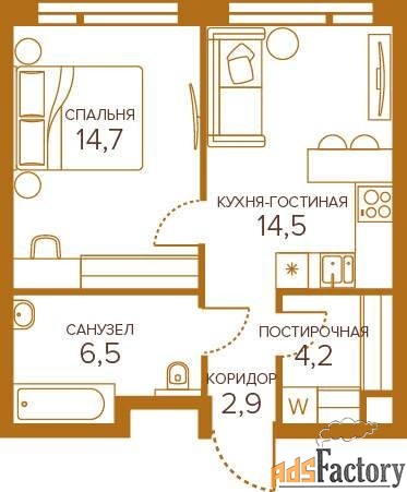 Общая площадь квартиры - 42.8 кв.м. В квартире выполнена премиальная отделка в неоклассическом стиле.