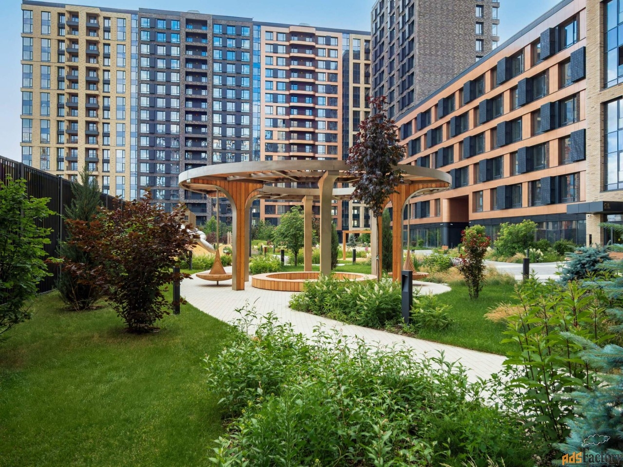 Внутренний двор 1,5 га функциональное и безопасное пространство для игр, работы и занятий спортом. Пешеходный променад для прогулок. Дома переменной этажности. Есть подземный паркинг.