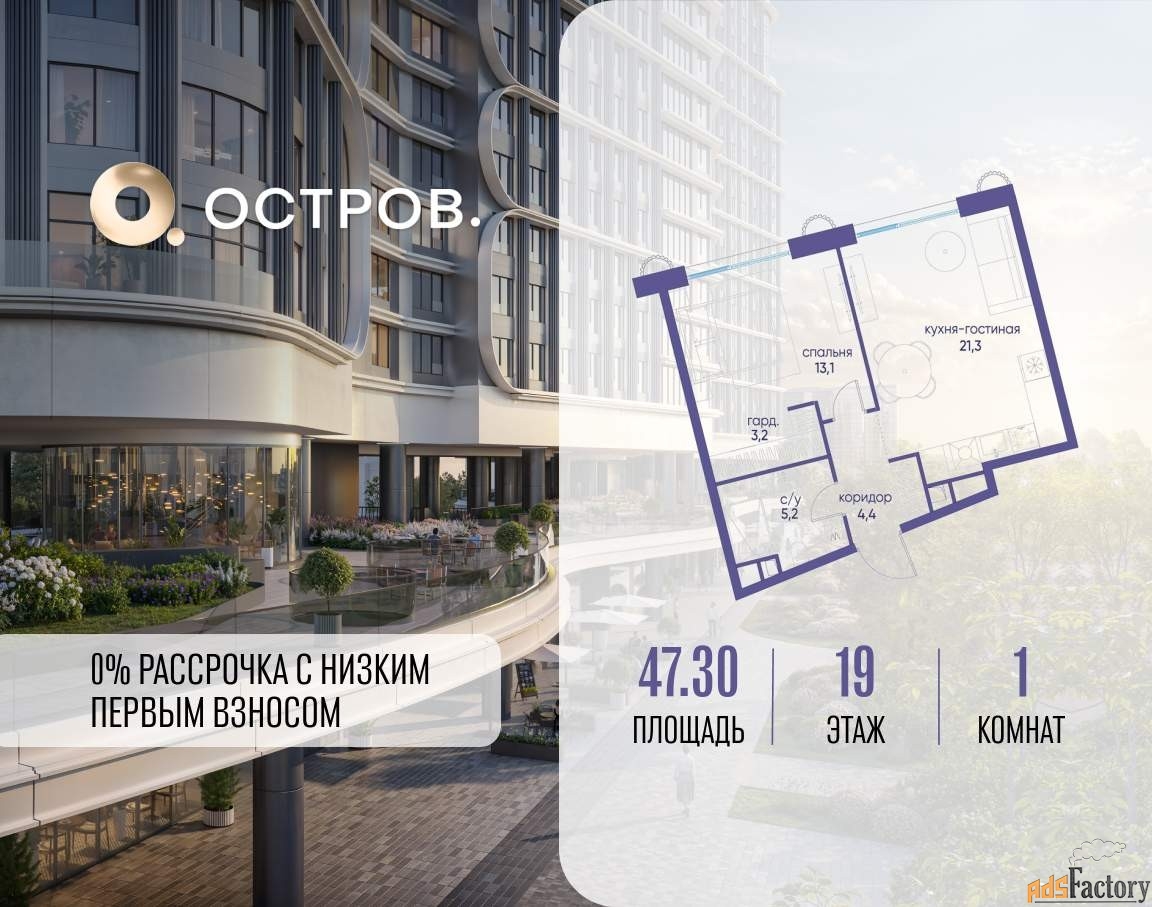 ОСТРОВ от Донстрой - жилой комплекс на западе Москвы, в Мневниковской пойме. Уникальное преимущество комплекса - в том, что он обособлен от города рекой и природным парком (650 га) . Благодаря природному окружению эта территория имеет лучший экологический рейтинг в столице. Кварталы ОСТРОВА объединены ландшафтным дизайном в единое пространство - с набережными и Центральным бульваром. На ОСТРОВЕ любые объекты, необходимые для полноценной жизни и отдыха, находятся на расстоянии 15-минутной прогулки. Торговый центр и супермаркеты, кафе и рестораны, фитнес, салоны красоты, школы и детские сады. А также крупнейший в Москве спортивный кластер. [#7940957#]