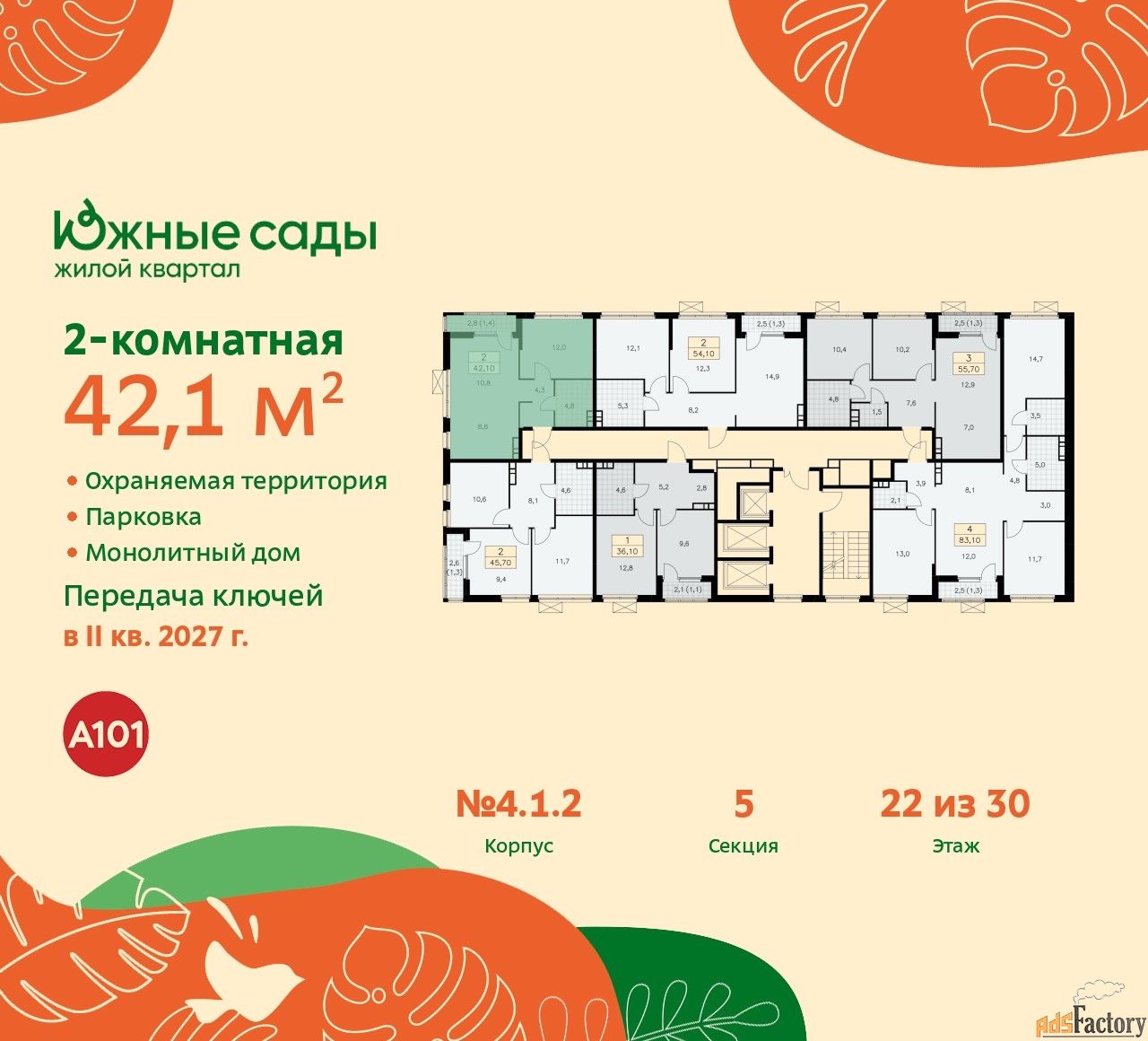 Дом монолитный, черырехподъездный, переменной этажности, от 11 до 30 этажей. Квартира находится в 4-й секции высотой 22 этажа в корпусе 4.1.2. На этаже 6 квартир. В подъезде 1 пассажирский и 1 грузовой лифт. Начало строительства - 2 квартал 2024 года. Окончание строительства - 2 квартал 2027 года. Оформление сделки по договору долевого участия.