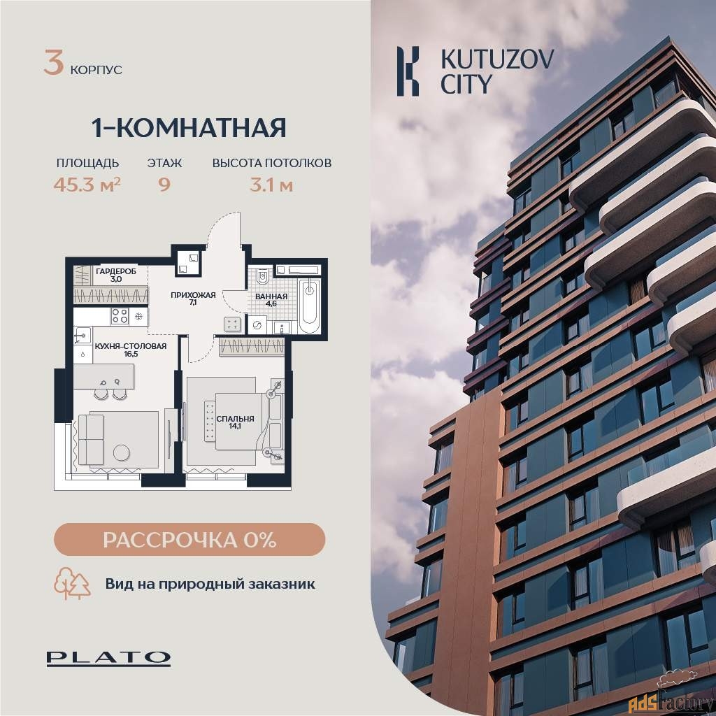 Продаётся светлая однокомнатная квартира площадью 45,3 м в башне «Созидание» клубного дома «Кутузов Сити». Планировка квартиры продумана до мелочей и позволяет создать комфортное пространство для жизни. Просторная кухня-столовая с панорамными окнами объединяет обеденную зону, кухню и гостиную. Изолированная спальня обеспечивает уединённое пространство для отдыха. Для хранения вещей предусмотрена отдельная гардеробная. Просторная ванная комната позволяет разместить как душевую кабину, так и большую ванную. Окна наполнят квартиру естественным светом и делают интерьер стильным. Высокие потолки придают пространству ощущение свободы и лёгкости. Продуманная планировка позволяет эффективно использовать каждый квадратный метр. О проекте: «Кутузов Сити» - клубный дом на 220 квартир, разработанный совместно с бюро Atrium и Oleg Klodt Architecture & Design. Проект строится в престижном Западном административном округе Москвы, всего в нескольких минутах ходьбы от Кутузовского проспекта. Закрытая территория, приватный двор, подземный паркинг и стильные лобби создают атмосферу комфорта и безопасности. В двух шагах от дома находится крупнейшая природная территория Москвы - природный заказник «Долина реки Сетунь». Камерная застройка и развитая инфраструктура делают «Кутузов Сити» отличным выбором для тех, кто ценит качество жизни и близость к природе. [#7169575#]
