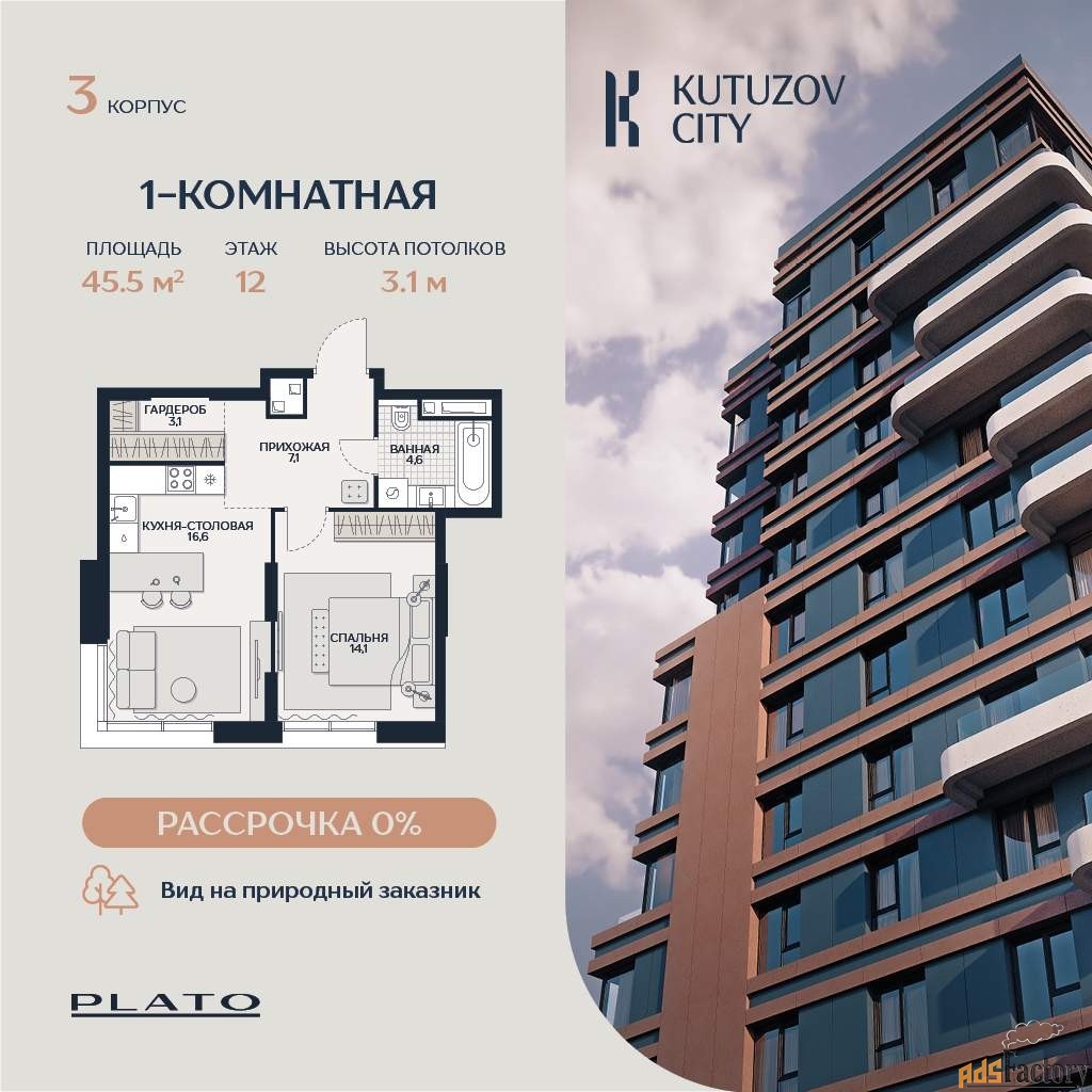 Продаётся светлая однокомнатная квартира евроформата площадью 45,5 м в башне «Созидание» клубного дома «Кутузов Сити». Планировка квартиры продумана до мелочей и позволяет создать комфортное пространство для жизни. Просторная кухня-столовая с панорамными окнами объединяет обеденную зону, кухню и гостиную. Изолированная спальня обеспечивает уединённое пространство для отдыха. Для хранения вещей предусмотрена отдельная гардеробная. Просторная ванная комната позволяет разместить как душевую кабину, так и большую ванную. Большие окна наполнят квартиру естественным светом и сделают интерьер стильным. Высокие потолки придают пространству ощущение свободы и лёгкости. Продуманная планировка позволяет эффективно использовать каждый квадратный метр. О проекте: «Кутузов Сити» - клубный дом на 220 квартир, разработанный совместно с бюро Atrium и Oleg Klodt Architecture & Design. Проект строится в престижном Западном административном округе Москвы, всего в нескольких минутах ходьбы от Кутузовского проспекта. Закрытая территория, приватный двор, подземный паркинг и стильные лобби создают атмосферу комфорта и безопасности. В двух шагах от дома находится крупнейшая природная территория Москвы - природный заказник «Долина реки Сетунь». Камерная застройка и развитая инфраструктура делают «Кутузов Сити» отличным выбором для тех, кто ценит качество жизни и близость к природе. [#7169579#]