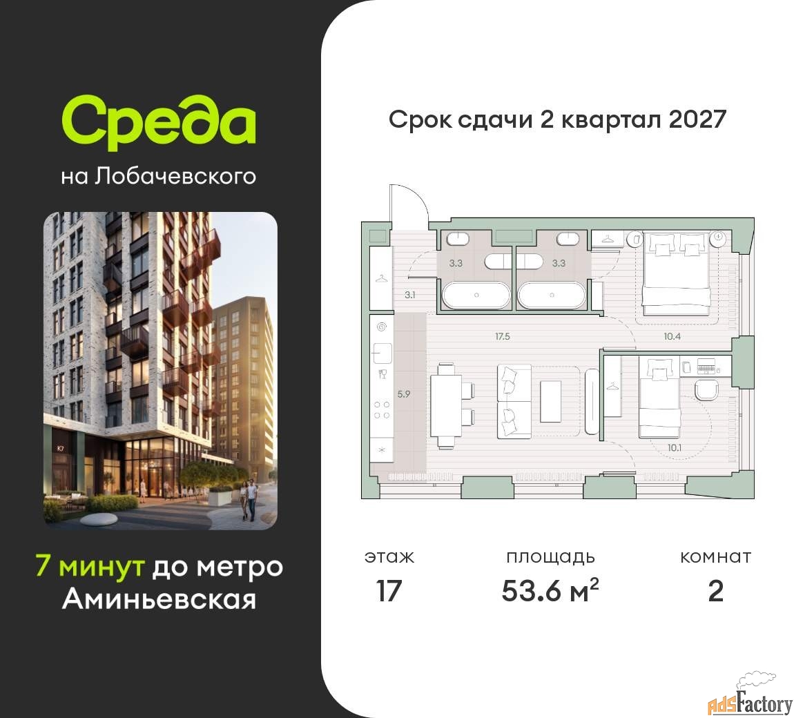 Квартира располагается на 17 этаже 27-этажного дома в ЖК Среда на Лобачевского.
