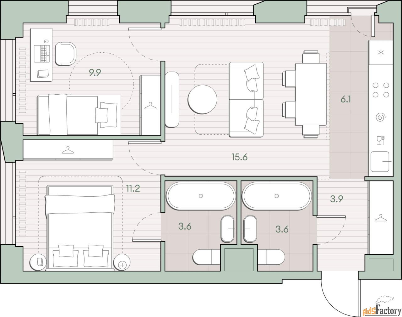 Жилая площадь 36.7 м2, кухня 6.1 м2, предчистовая отделка, комнаты изолированные.