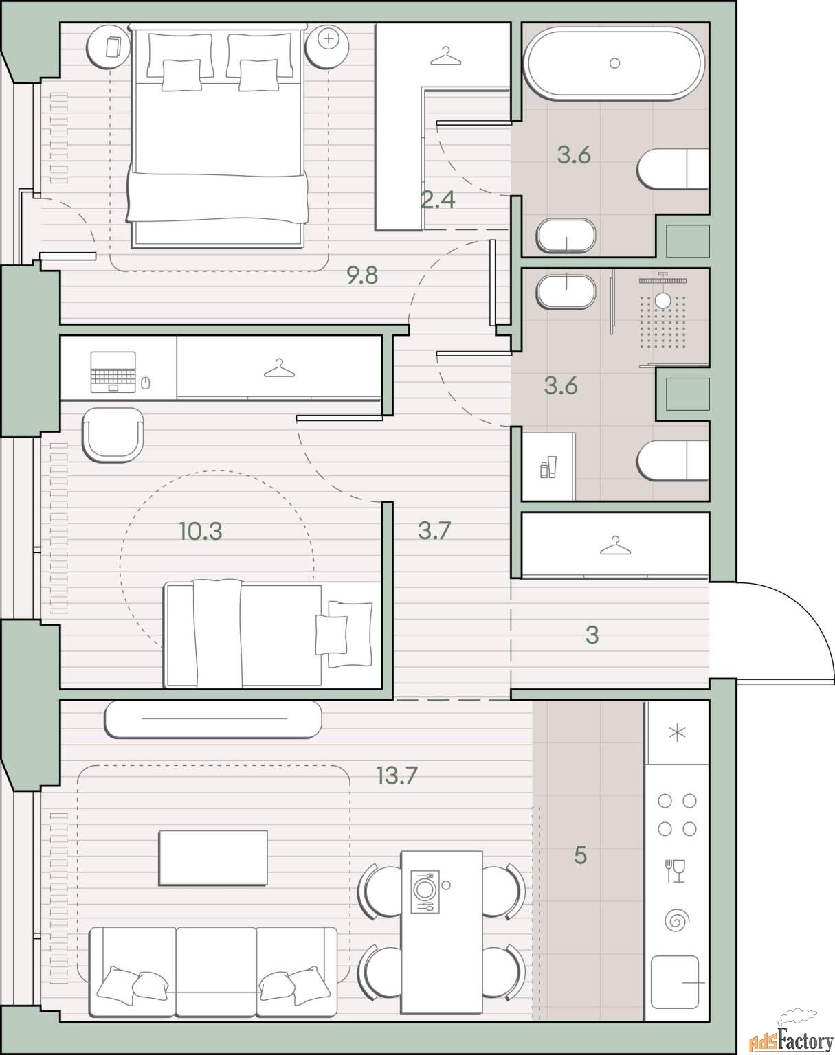 Жилая площадь 33.8 м2, кухня 5 м2, предчистовая отделка, комнаты изолированные.