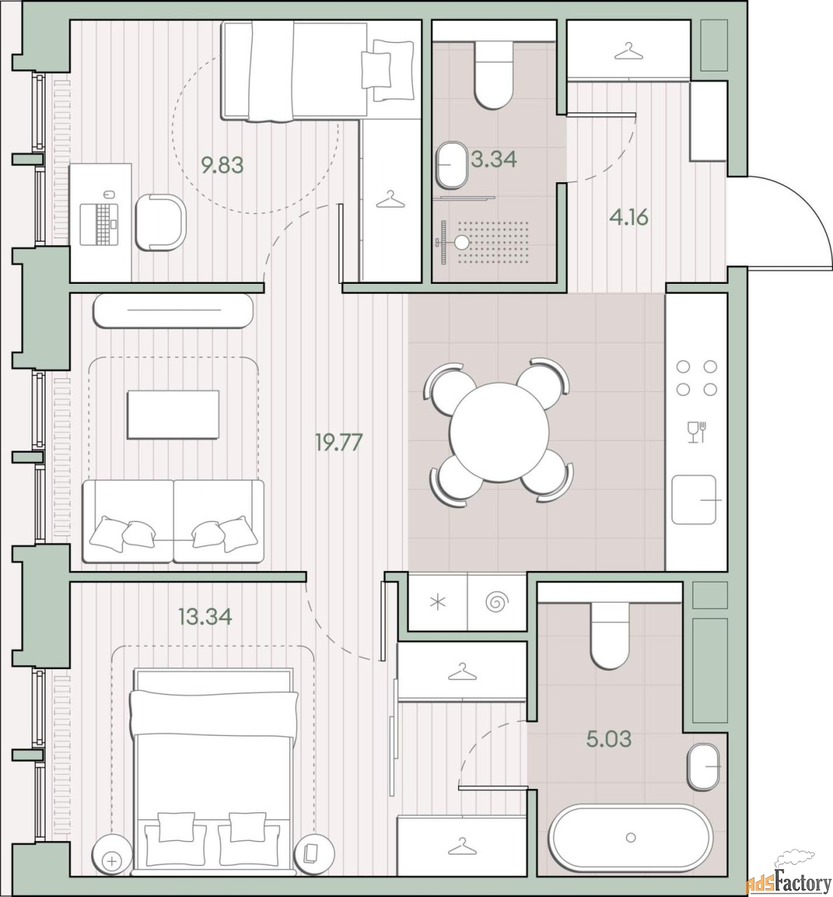 Жилая площадь 23.17 м2, кухня 19.77 м2, квартира без отделки, комнаты изолированные.