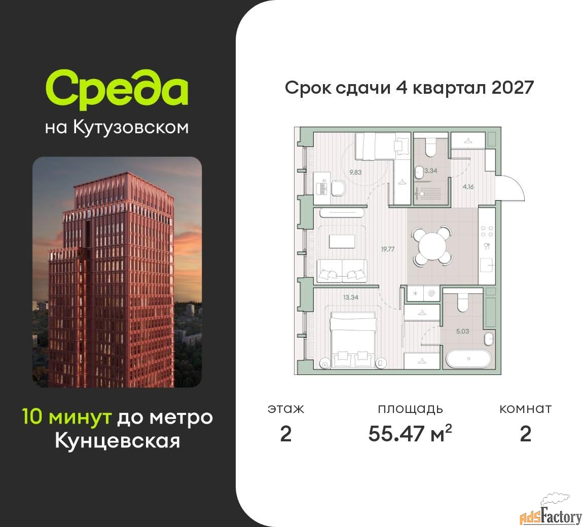 Квартира располагается на 2 этаже 12-этажного дома в ЖК Среда на Кутузовском.