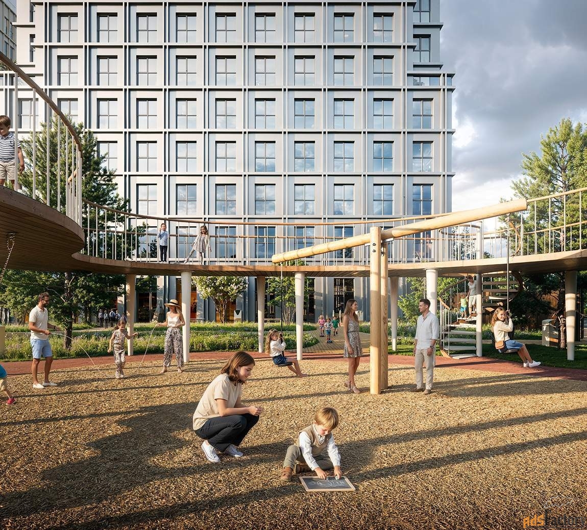 Отдельная многоуровневая парковка. Инфраструктура: детские площадки, спортивные площадки.