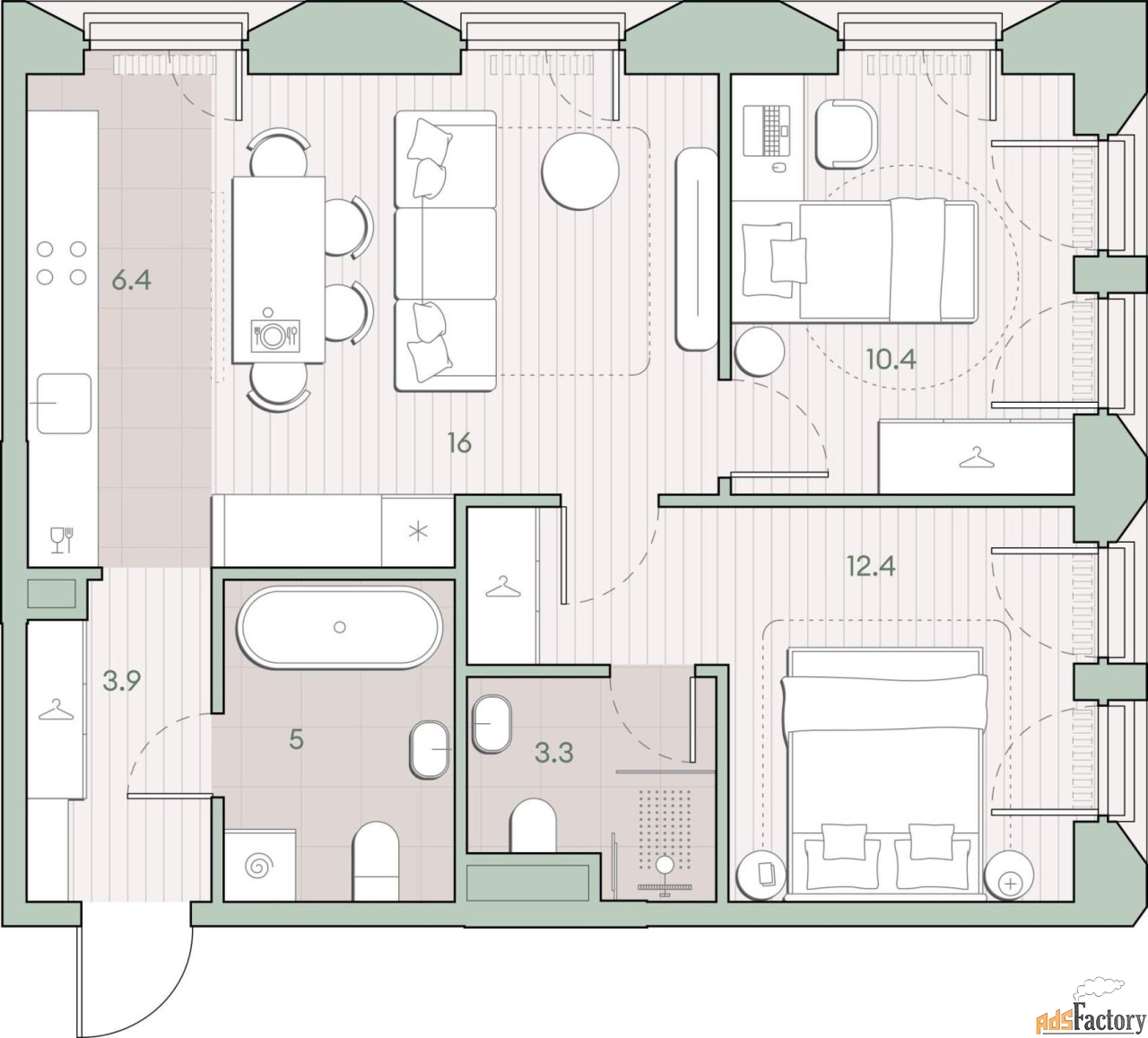 Жилая площадь 38.8 м2, кухня 6.4 м2, предчистовая отделка, комнаты изолированные.
