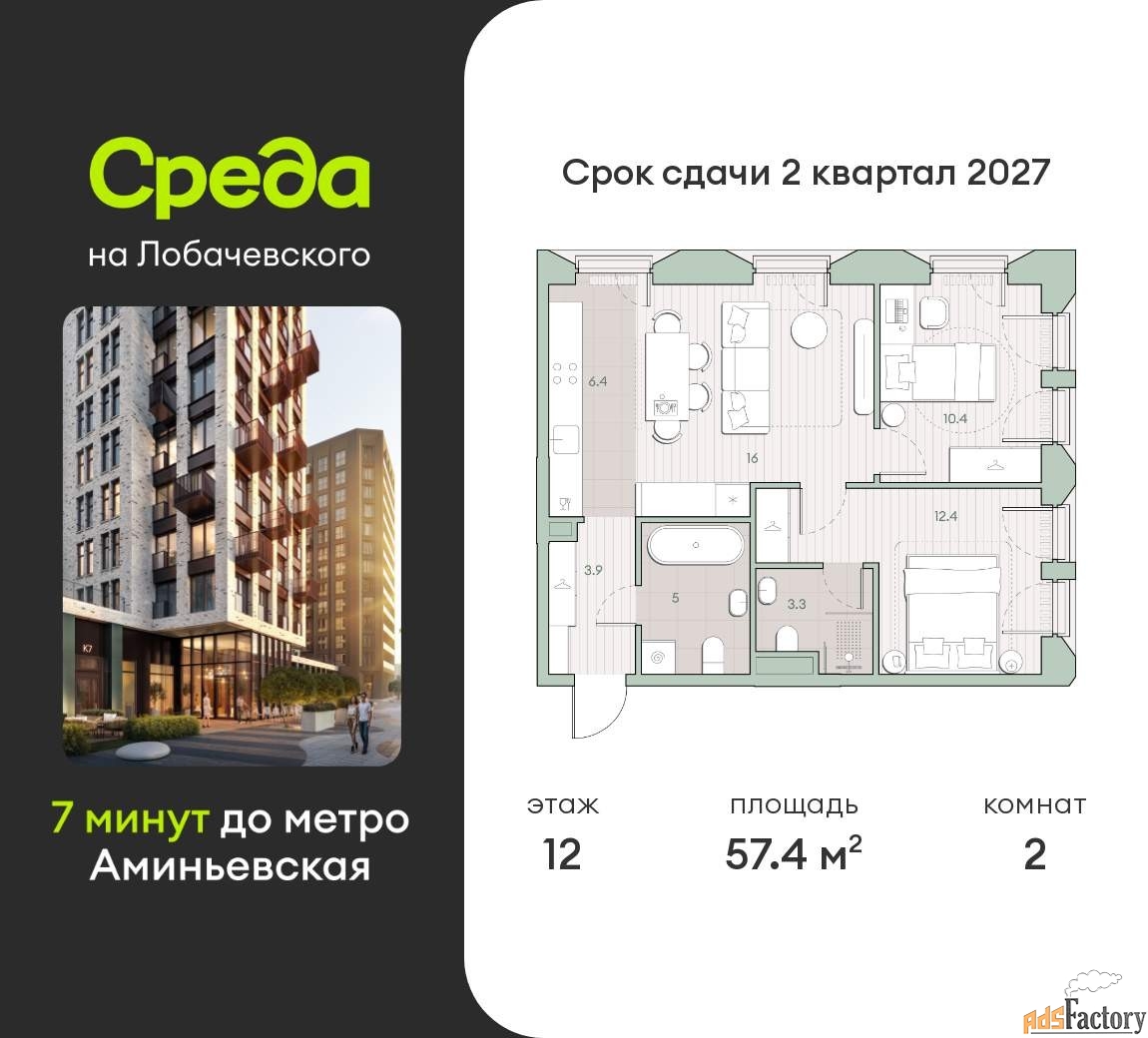Квартира располагается на 12 этаже 13-этажного дома в ЖК Среда на Лобачевского.