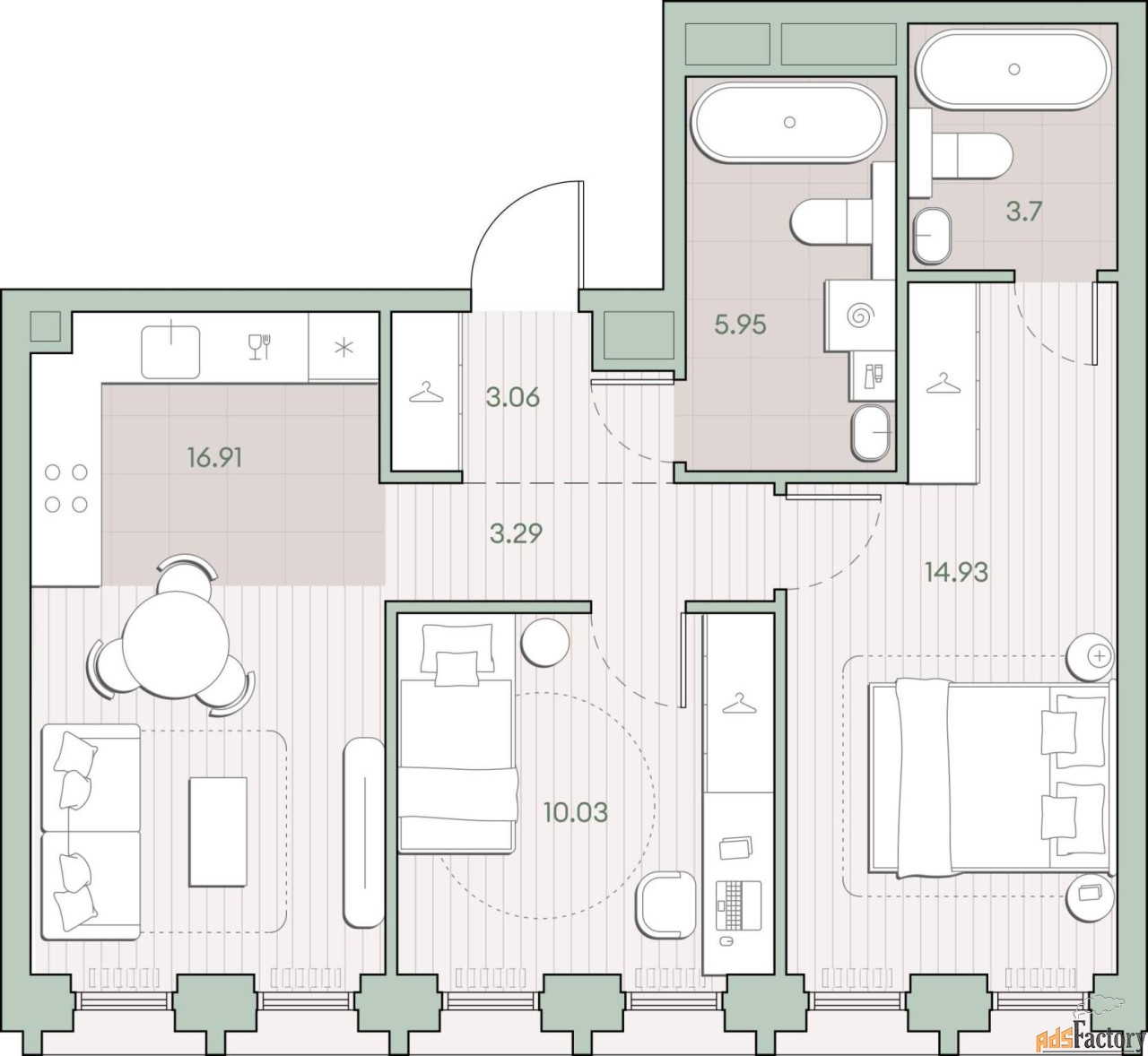 Жилая площадь 24.96 м2, кухня 16.91 м2, предчистовая отделка, комнаты изолированные.