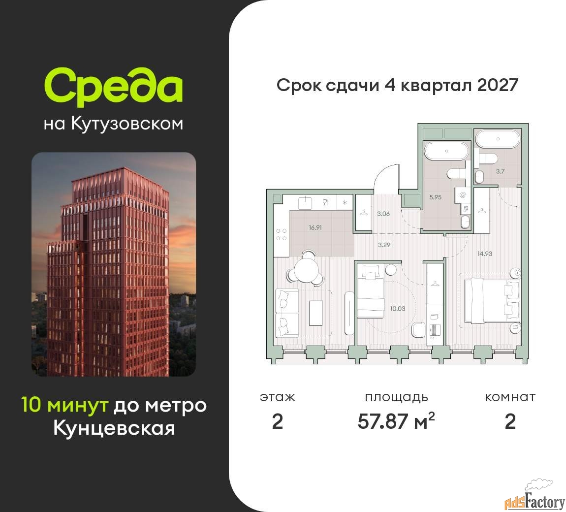Квартира располагается на 2 этаже 44-этажного дома в ЖК Среда на Кутузовском.
