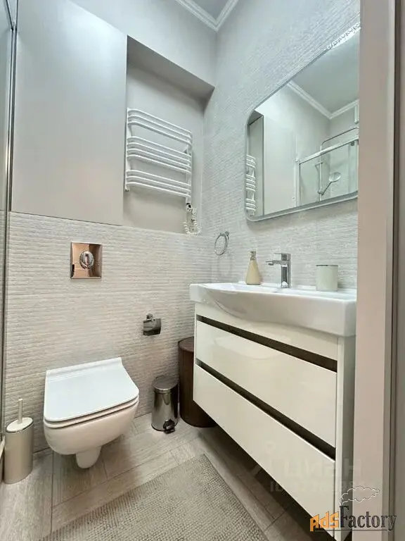 Два отдельных санузла, подогрев пола, ванна и душевая кабина, стиральная машина, шкафы.