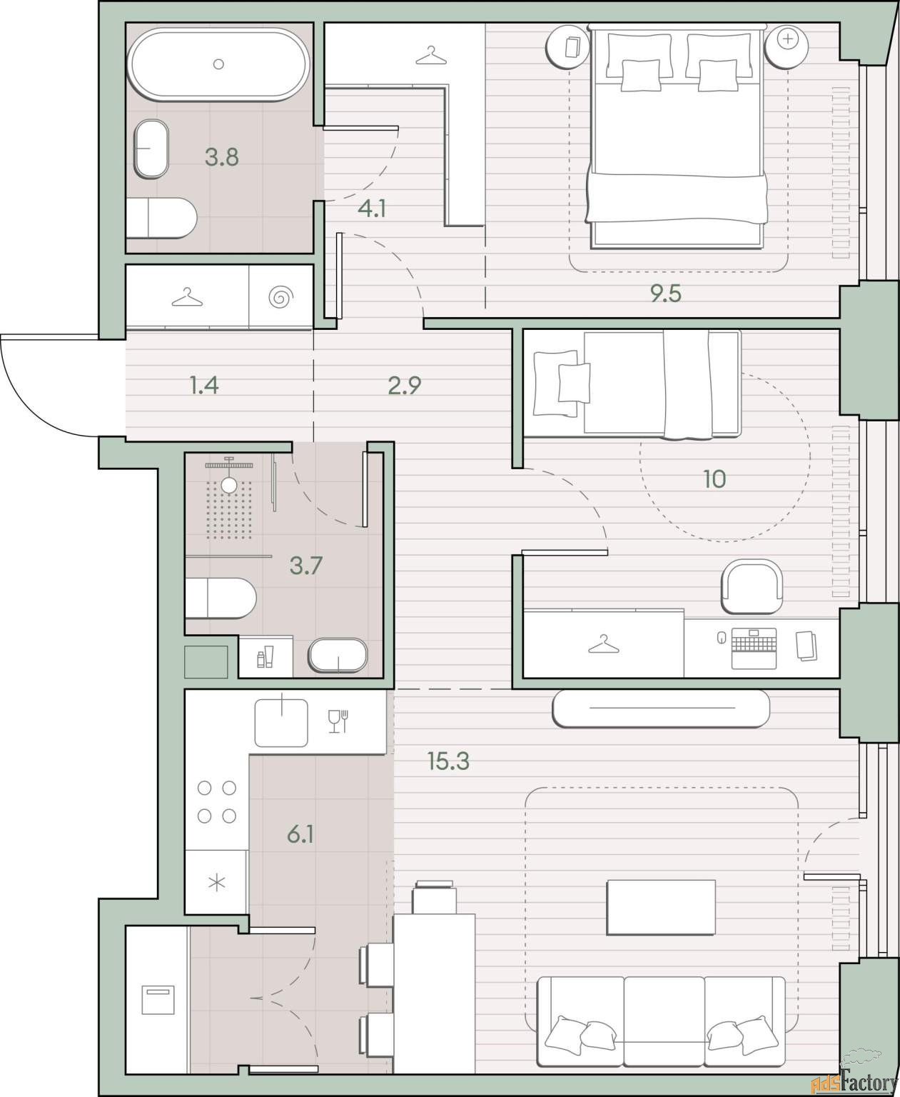 Жилая площадь 34.8 м2, предчистовая отделка, комнаты изолированные.