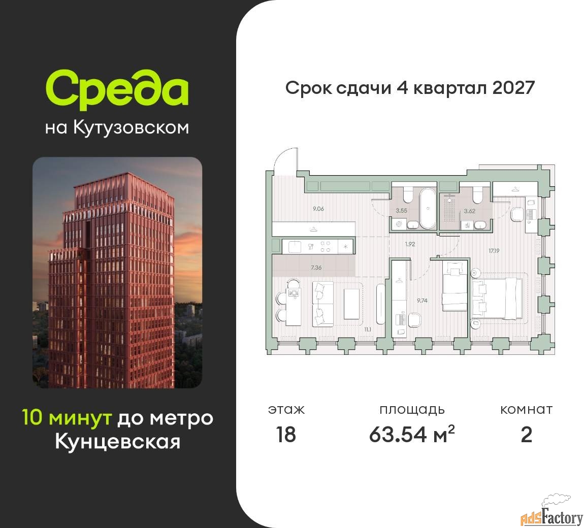 Квартира располагается на 18 этаже 44-этажного дома в ЖК Среда на Кутузовском.