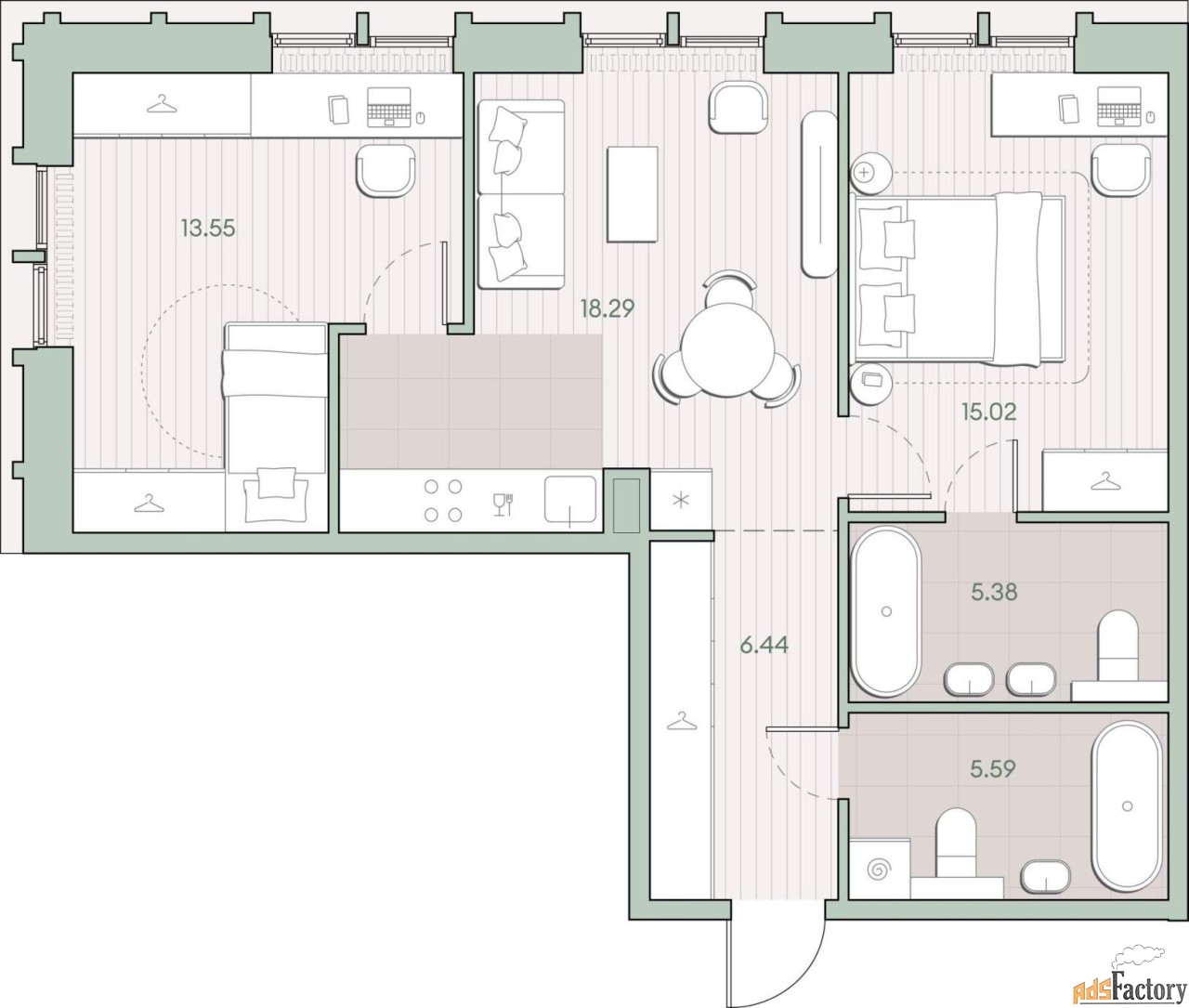 Жилая площадь 28.57 м2, кухня 18.29 м2, квартира без отделки, комнаты изолированные.