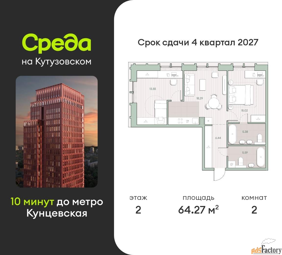Квартира располагается на 2 этаже 12-этажного дома в ЖК Среда на Кутузовском.