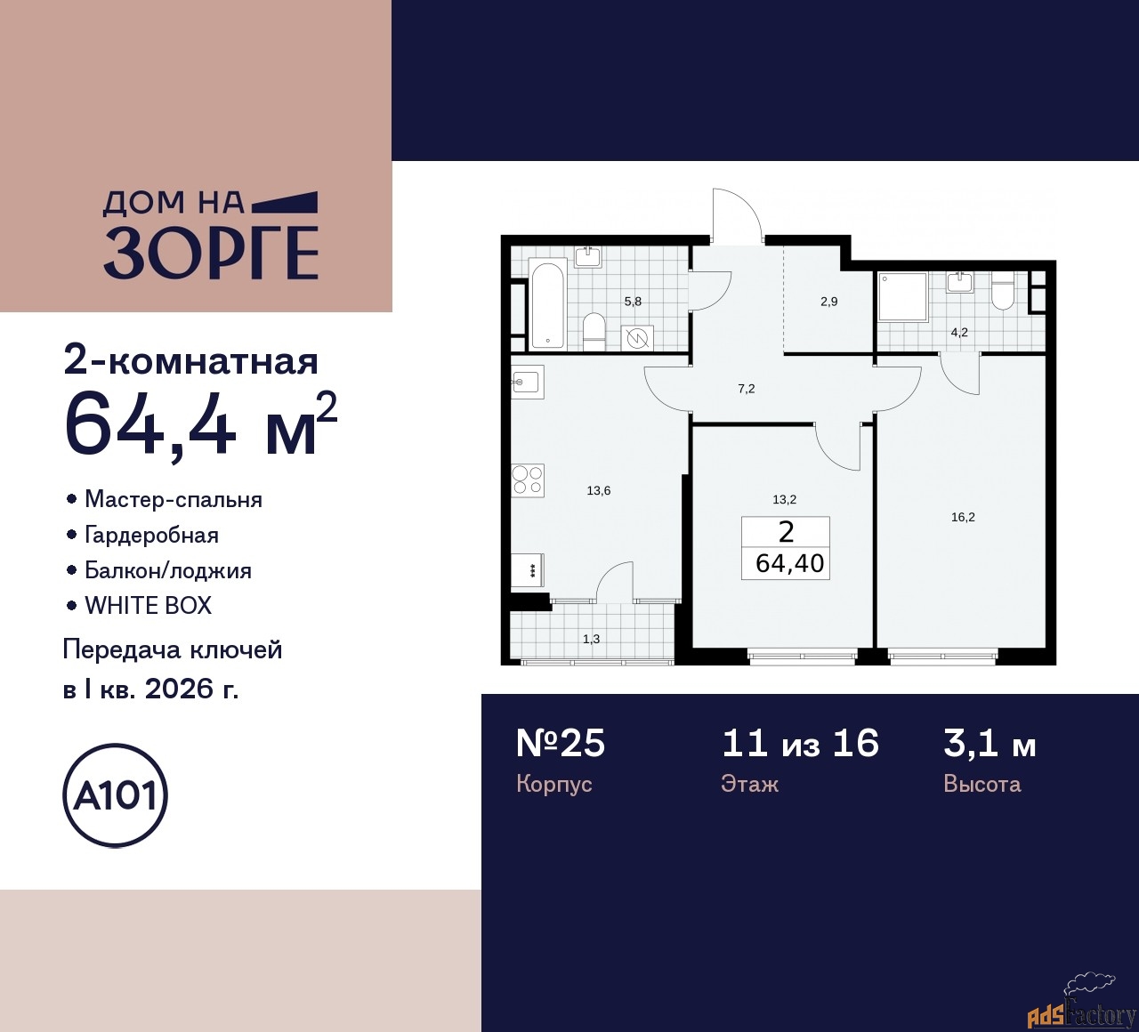 Дом монолитный, двухподъездный, высотой 16 этажей. Квартира находится в 1-й секции в корпусе 25. На этаже 13 квартир. В подъезде 2 пассажирских и 1 грузовой лифт. Начало строительства - 2 квартал 2023 года. Окончание строительства - 1 квартал 2026 года. Оформление сделки по договору долевого участия.