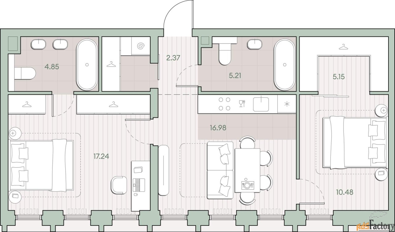 Жилая площадь 27.72 м2, кухня 16.98 м2, предчистовая отделка, комнаты изолированные.