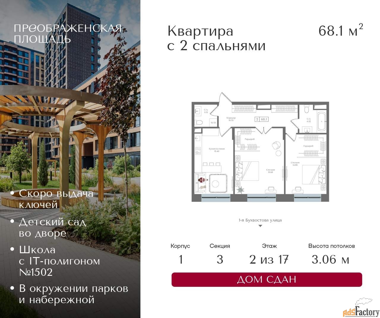 Квартира на 2 этаже в жилом комплексе премиум-класса «Преображенская площадь». Общая площадь: 68.1 кв.м.