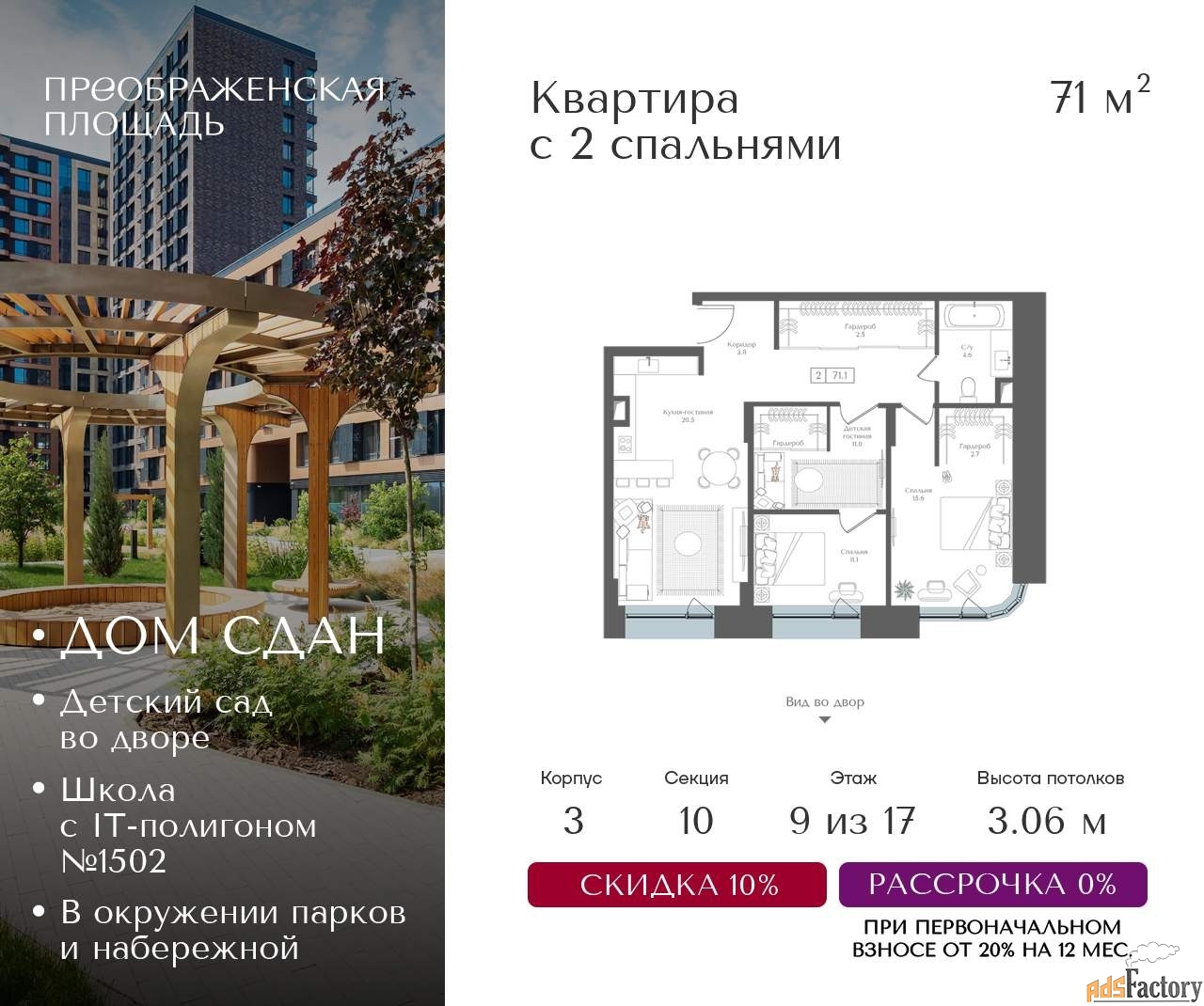 Квартира на 9 этаже в жилом комплексе премиум-класса «Преображенская площадь». Общая площадь: 71 кв.м.