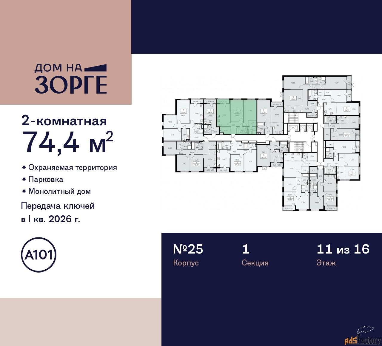 Дом монолитный, двухподъездный, высотой 16 этажей. Квартира находится в 1-й секции в корпусе 25. На этаже 13 квартир. В подъезде 2 пассажирских и 1 грузовой лифт. Начало строительства - 2 квартал 2023 года. Окончание строительства - 1 квартал 2026 года. Оформление сделки по договору долевого участия.