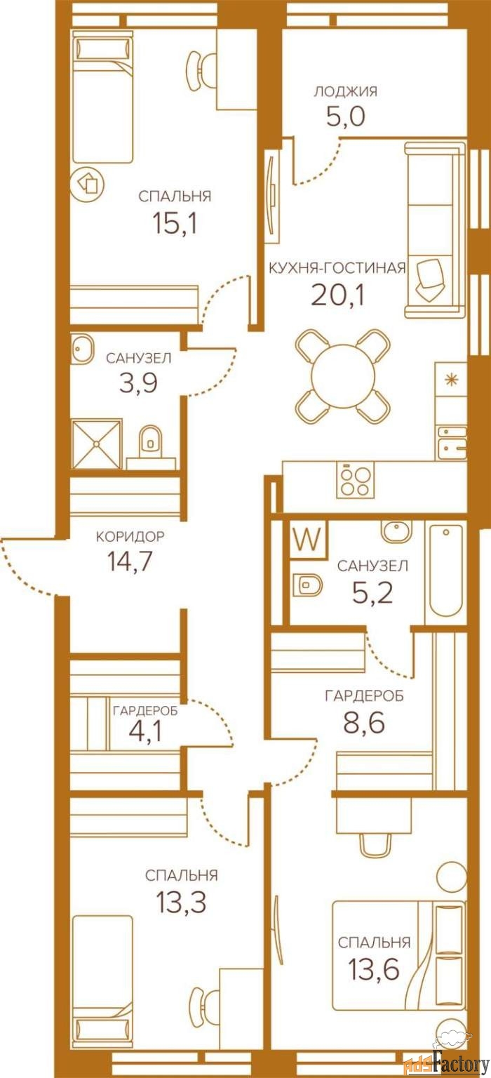 Общая площадь квартиры - 100.69 кв.м. В квартире выполнена премиальная отделка в неоклассическом стиле.