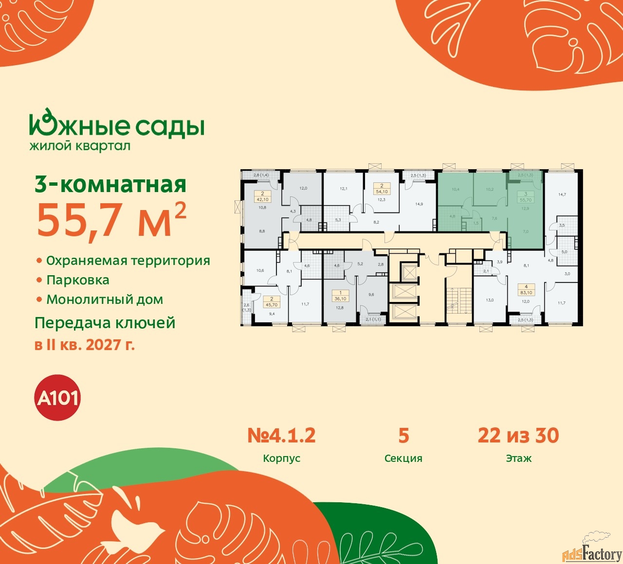 Дом монолитный, черырехподъездный, переменной этажности, от 11 до 30 этажей. Квартира находится в 4-й секции высотой 22 этажа в корпусе 4.1.2. На этаже 6 квартир. В подъезде 1 пассажирский и 1 грузовой лифт. Начало строительства - 2 квартал 2024 года. Окончание строительства - 2 квартал 2027 года. Оформление сделки по договору долевого участия.