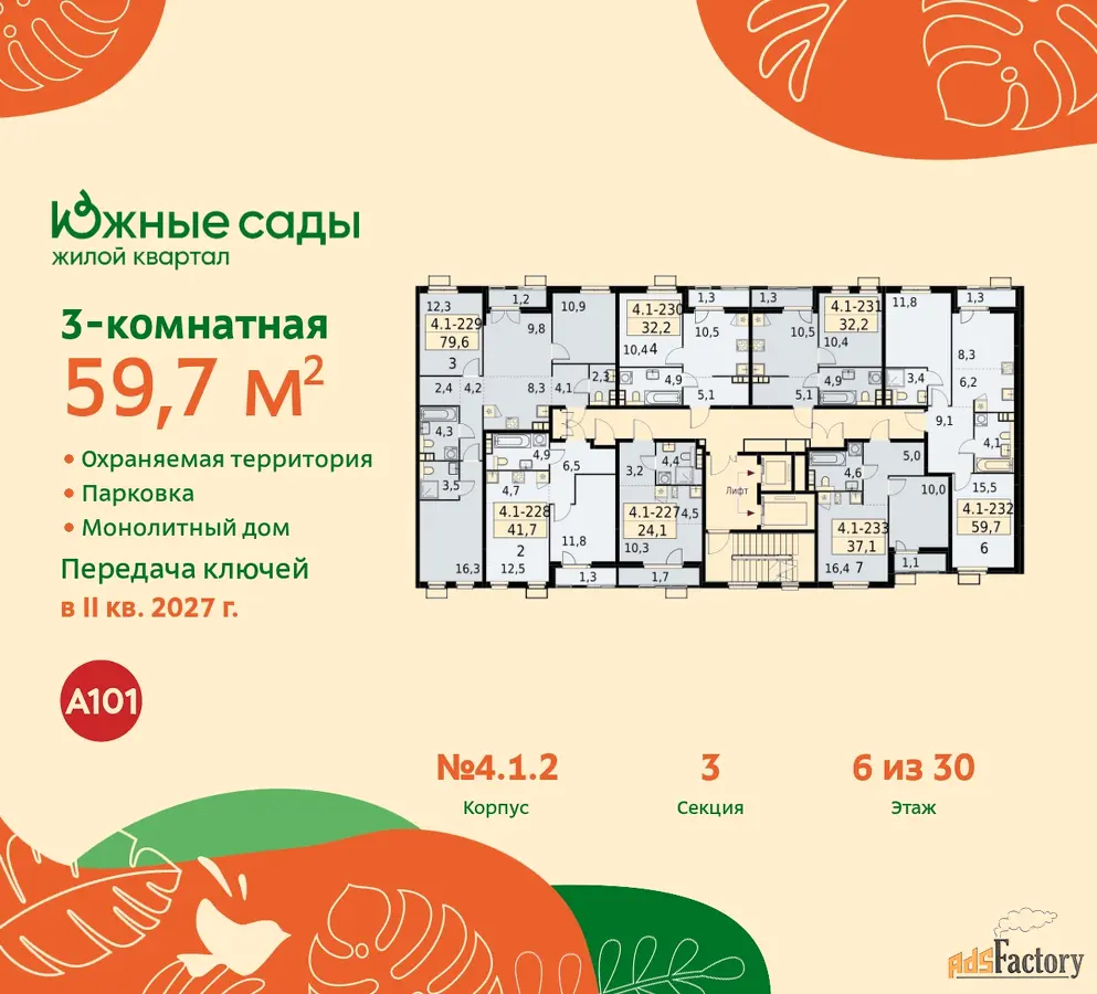 Артикул квартиры по базе застройщика 99К-4.1.2-232.