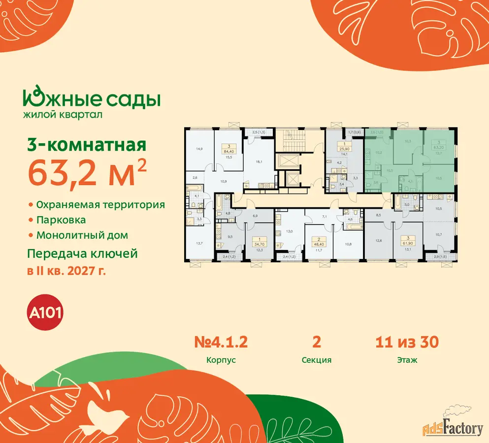 Дом монолитный, черырехподъездный, переменной этажности, от 11 до 30 этажей. Квартира находится в 1-й секции высотой 11 этажей в корпусе 4.1.2. На этаже 6 квартир. В подъезде 1 пассажирский и 1 грузовой лифт. Начало строительства - 2 квартал 2024 года. Окончание строительства - 2 квартал 2027 года. Оформление сделки по договору долевого участия.