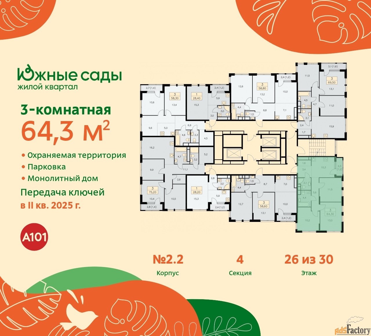 Квартира находится в корпусе 2.2. Дом монолитный, одноподъездный, высотой 30 этажей. На этаже 8 квартир. В подъезде 3 грузовых лифта. Начало строительства - 2 квартал 2022 года. Окончание строительства - 1 квартал 2026 года. Оформление сделки по договору долевого участия.