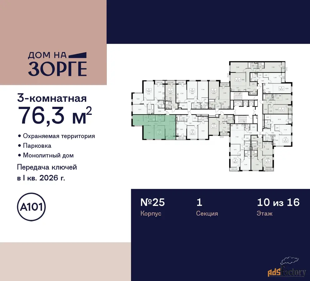 Дом монолитный, двухподъездный, высотой 16 этажей. Квартира находится в 1-й секции в корпусе 25. На этаже 13 квартир. В подъезде 2 пассажирских и 1 грузовой лифт. Начало строительства - 2 квартал 2023 года. Окончание строительства - 1 квартал 2026 года. Оформление сделки по договору долевого участия.