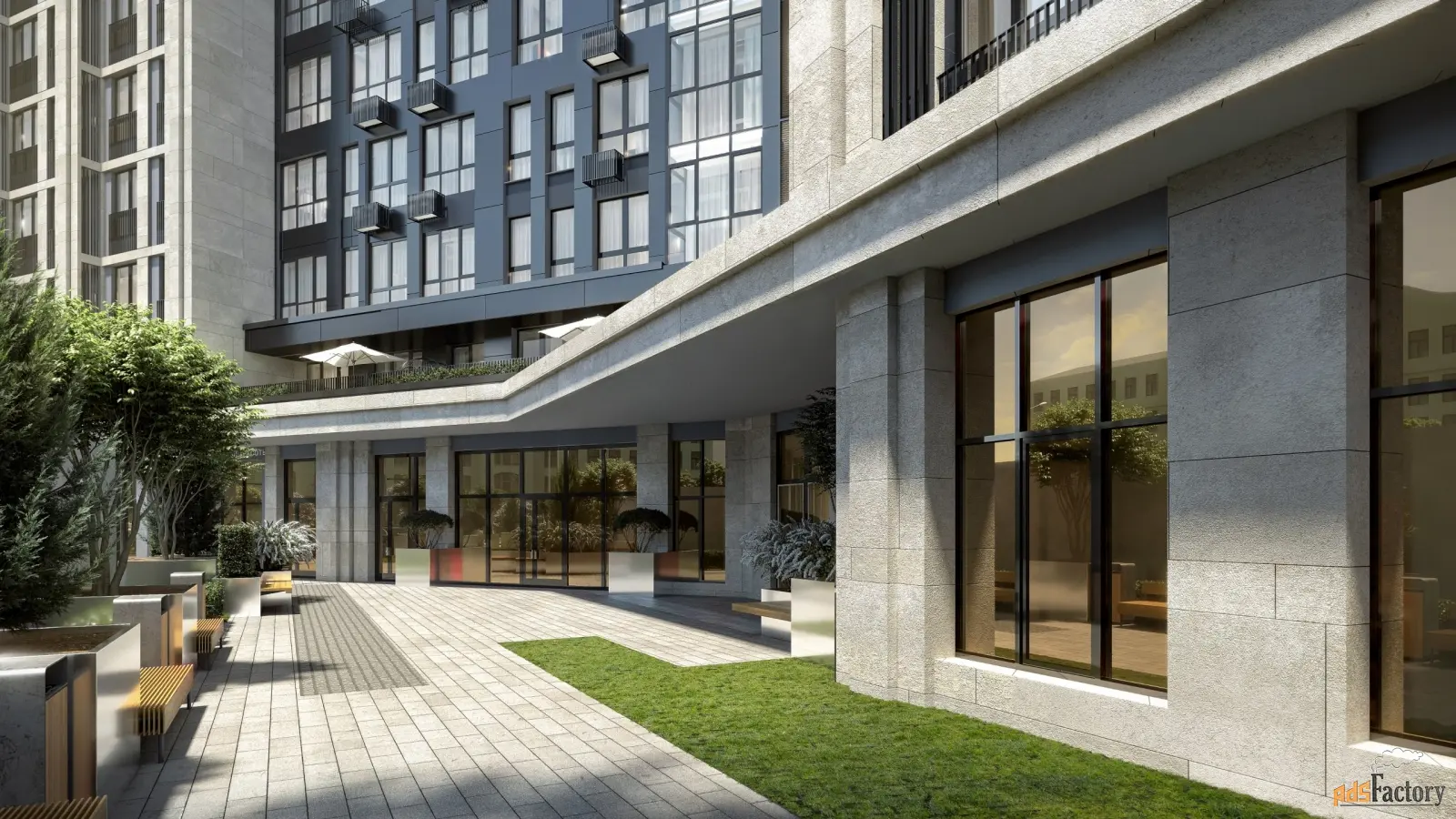 На территории дома будут благоустроены общий и приватный (доступный только жителям) дворы. Дизайн каждой функциональной зоны уникален, а вместе они подчёркивают благородный архитектурный стиль здания. В основе цветовых решений – «отражение» фасадов, мягкие природные оттенки. (AQID02221155)