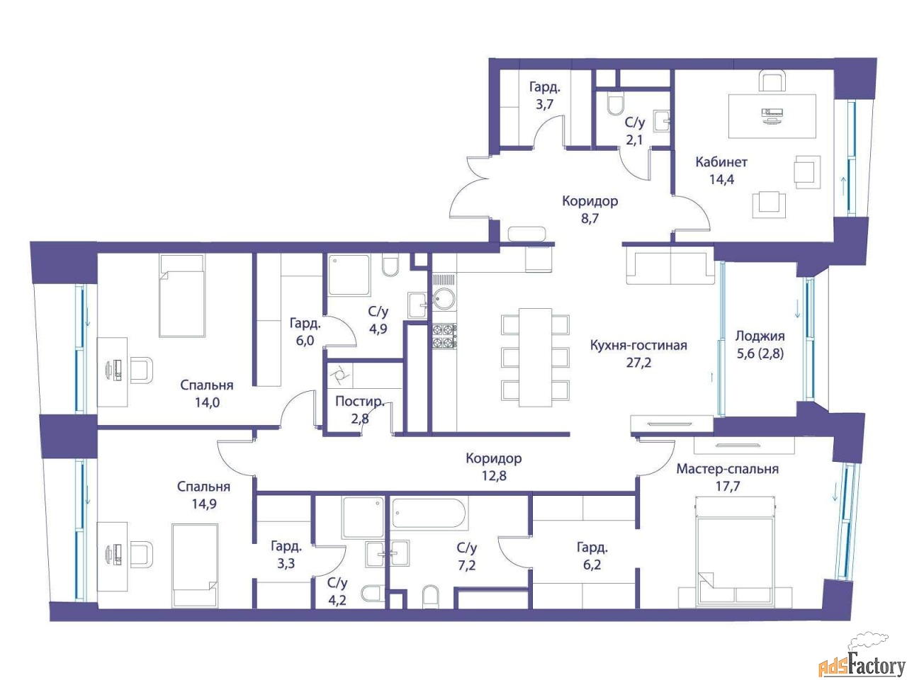 В квартире продуманная функциональная планировка с просторной кухней 27.20 м2. Жилая площадь - 61.00 м2. Высота потолка от 3,65 м. Изолированные комнаты, 4 санузла(1 раздельный и 3 совмещенных) . Окна на смежные стороны. Виды на природный парк и реку.