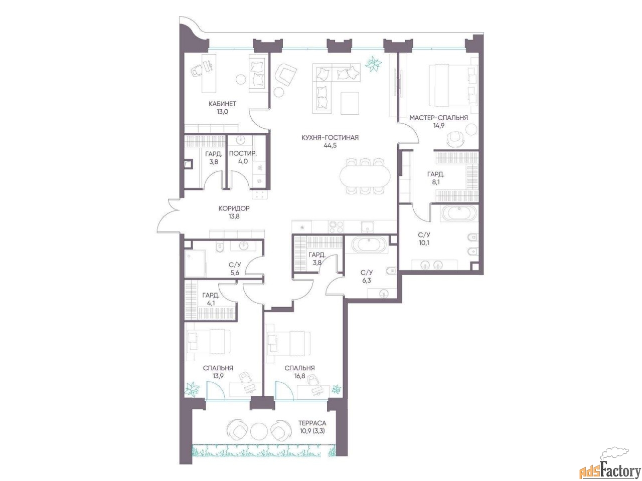 В доме всего 109 квартир: лоты с патио, пентхаусы с панорамными террасами и возможностью установки камина, а также классические элитные квартиры с большими гостиными, мастер-спальнями, приватными ванными и гардеробными, террасами и лоджиями.