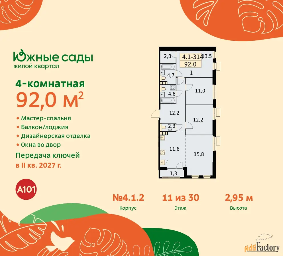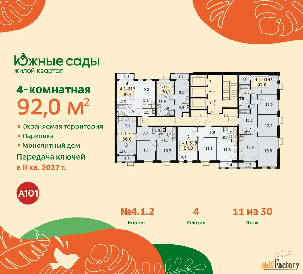 Дом монолитный, черырехподъездный, переменной этажности, от 11 до 30 этажей. Квартира находится в 3-й секции высотой 30 этажей в корпусе 4.1.2. На этаже 5 квартир. В подъезде 2 пассажирских и 1 грузовой лифт. Начало строительства - 2 квартал 2024 года. Окончание строительства - 2 квартал 2027 года. Оформление сделки по договору долевого участия.