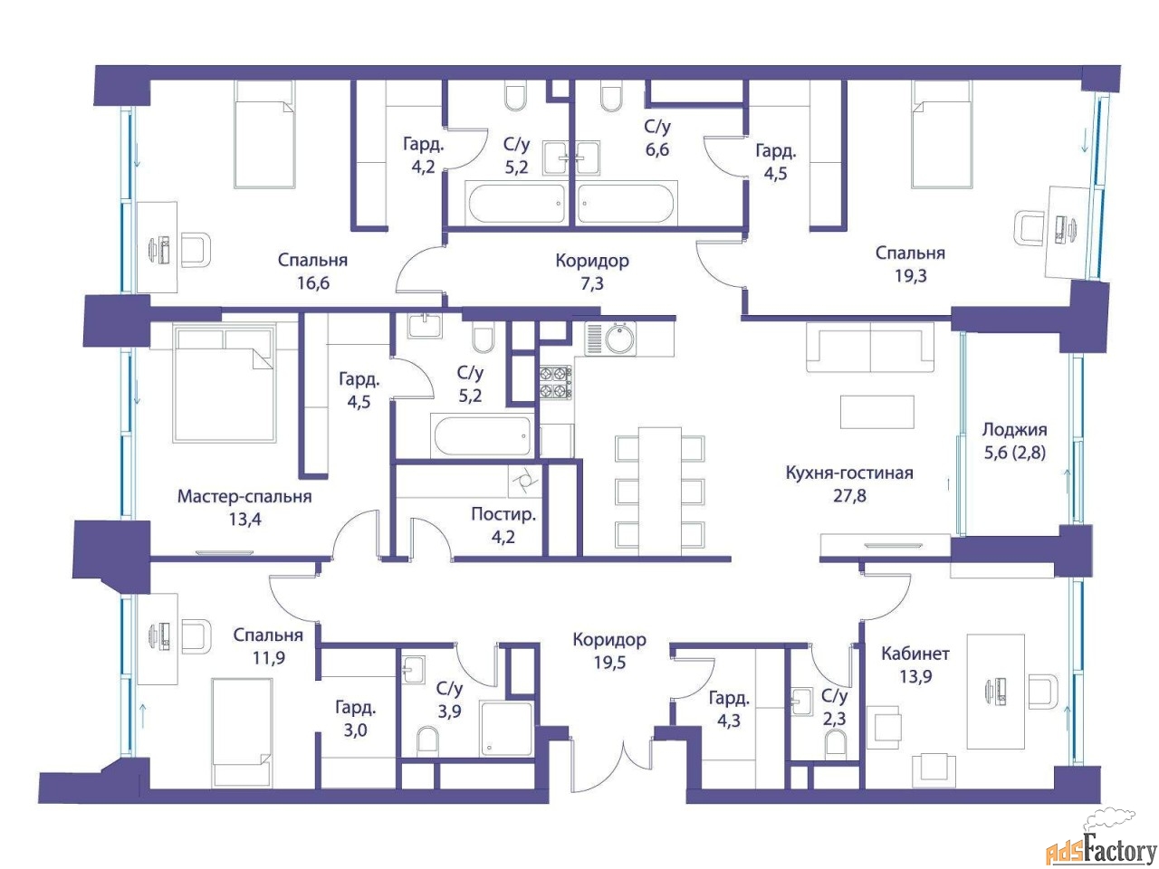 В квартире продуманная функциональная планировка с просторной кухней 27.80 м2. Жилая площадь - 75.10 м2. Высота потолка от 3,65 м. Изолированные комнаты, 5 санузлов(1 раздельный и 4 совмещенных) . Окна на смежные стороны. Виды на природный парк и реку.