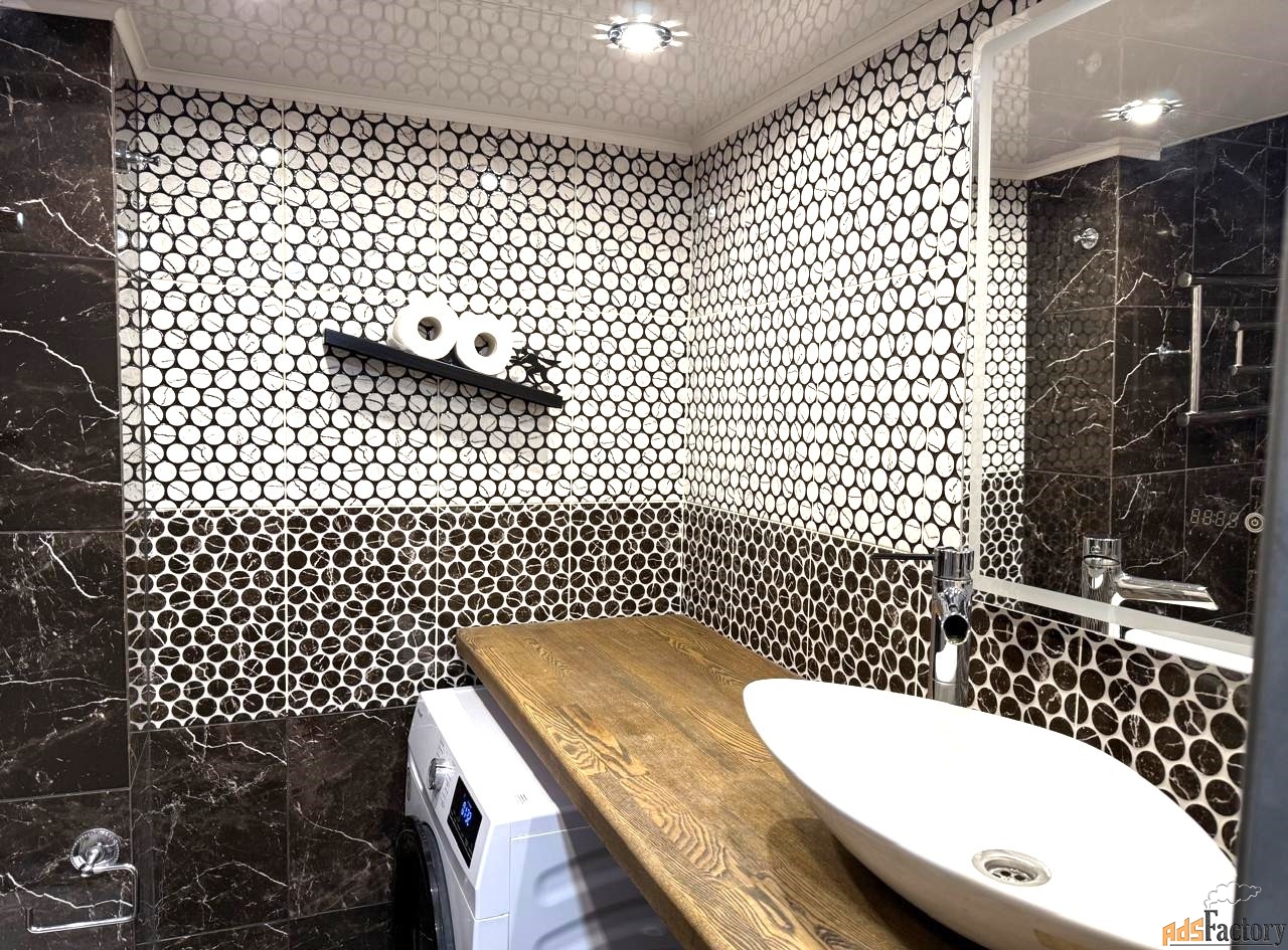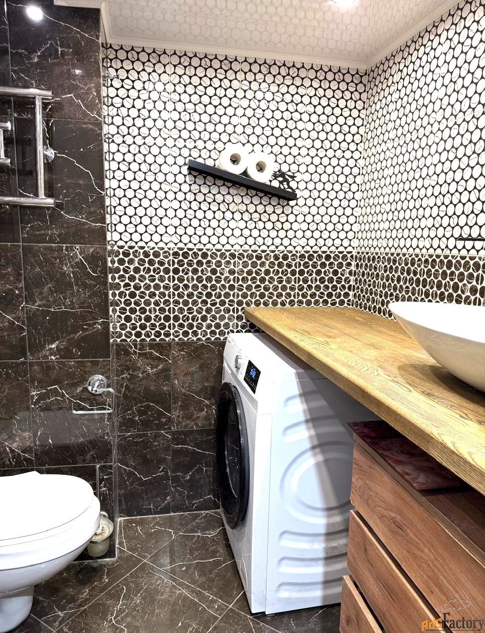 Санузел совмещённый и выполнен в качественной керамической плитке. Вся мебель и техника остается новым владельцам.