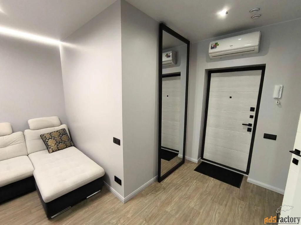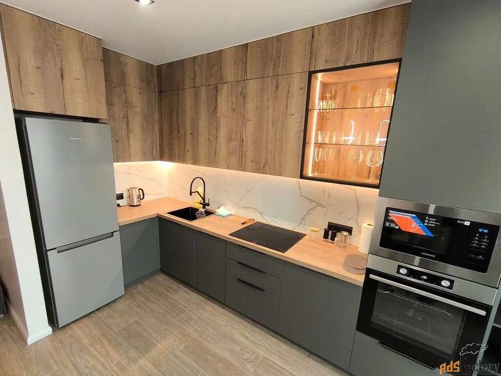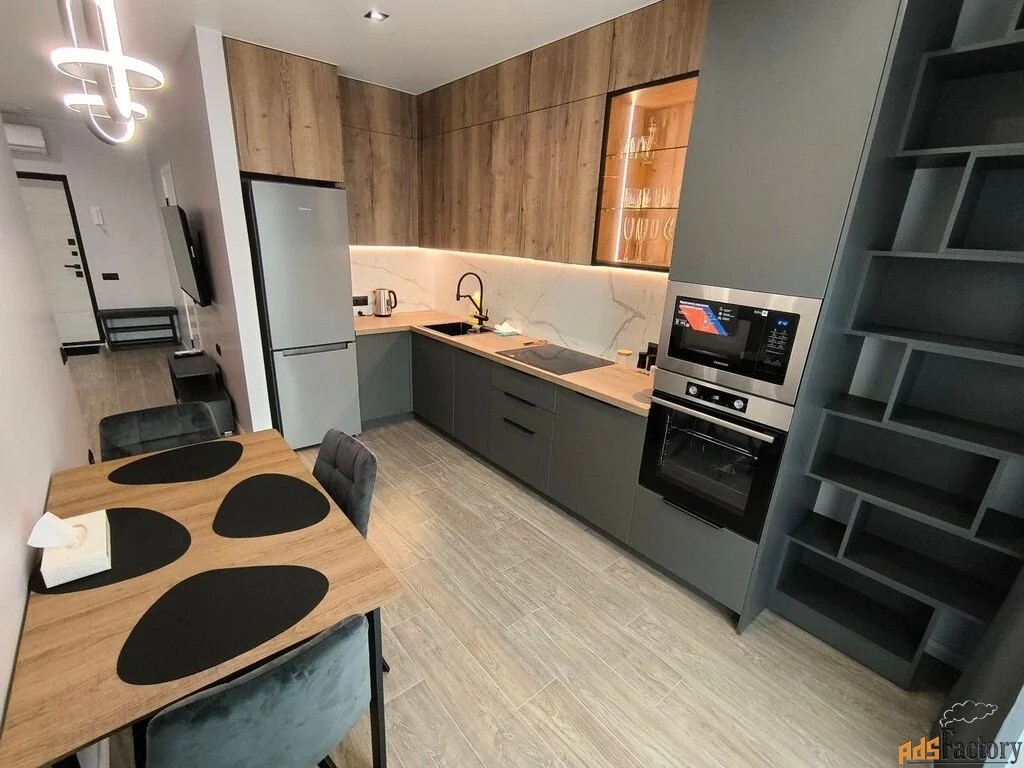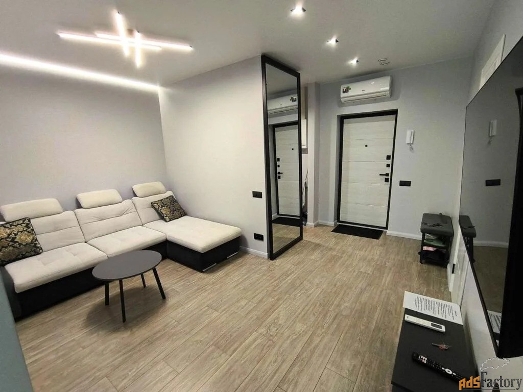 В квартире есть все необходимое для комфортного проживания: мебель и стильная кухня с индукционной плитой и холодильником, стиральная машина, кондиционер. С застекленным балконом (4 кв.м.) площадь квартиры составляет 50 кв.м. - полноценная евродвушка! Квартира в доме 2021 года постройки.