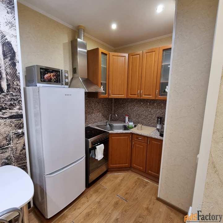 В квартире две большие кровати, холодильник, микроволновая печь, электрическая плита, чайник, посуда вся есть.