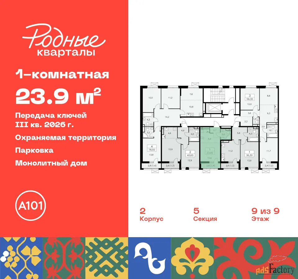 Дом монолитный, многоподъездный, высотой 9 этажей. Квартира находится в 5-й секции в корпусе 2. На этаже 5 квартир. В подъезде 1 грузовой лифт. Начало строительства - 4 квартал 2023 года. Окончание строительства - 3 квартал 2026 года. Оформление сделки по договору долевого участия.