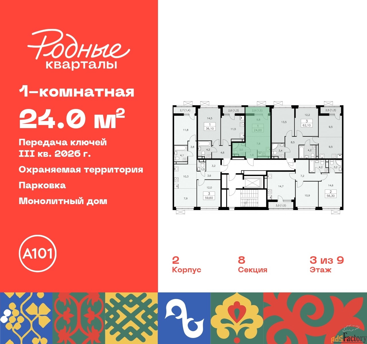 Дом монолитный, многоподъездный, высотой 9 этажей. Квартира находится в 8-й секции в корпусе 2. На этаже 5 квартир. В подъезде 1 грузовой лифт. Начало строительства - 4 квартал 2023 года. Окончание строительства - 3 квартал 2026 года. Оформление сделки по договору долевого участия.