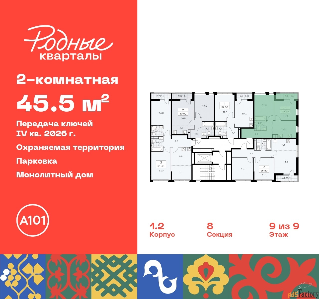 Дом монолитный, многоподъездный, высотой 9 этажей. Квартира находится в 7-й секции в корпусе 1.2. На этаже 5 квартир. В подъезде 1 грузовой лифт. Начало строительства - 4 квартал 2023 года. Окончание строительства - 4 квартал 2026 года. Оформление сделки по договору долевого участия.
