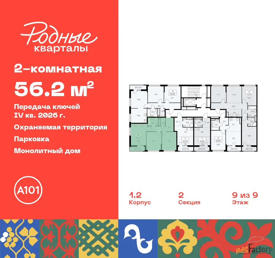 Дом монолитный, многоподъездный, высотой 9 этажей. Квартира находится в 1-й секции в корпусе 1.2. На этаже 6 квартир. В подъезде 1 грузовой лифт. Начало строительства - 4 квартал 2023 года. Окончание строительства - 4 квартал 2026 года. Оформление сделки по договору долевого участия.