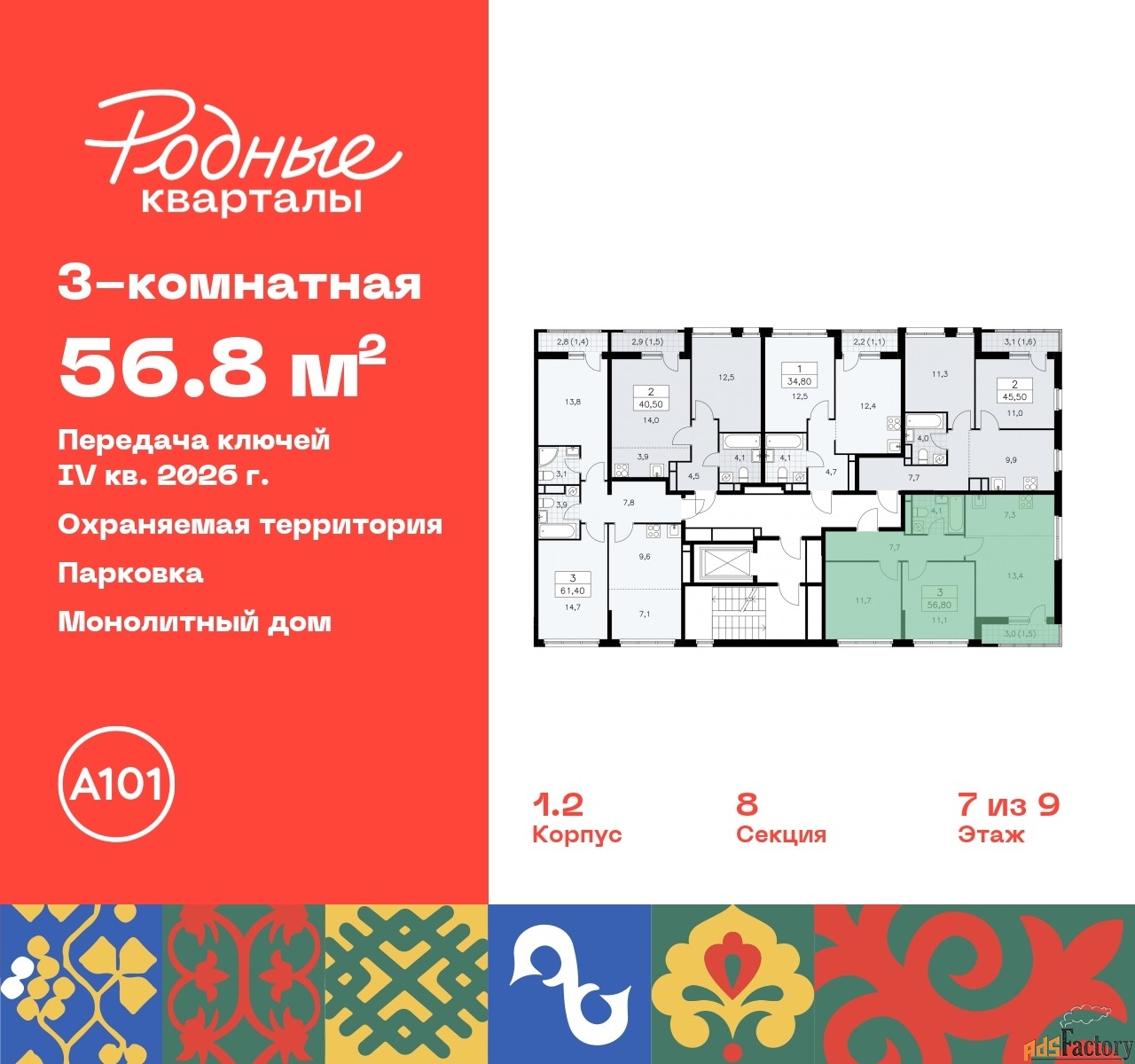 Дом монолитный, многоподъездный, высотой 9 этажей. Квартира находится в 7-й секции в корпусе 1.2. На этаже 5 квартир. В подъезде 1 грузовой лифт. Начало строительства - 4 квартал 2023 года. Окончание строительства - 4 квартал 2026 года. Оформление сделки по договору долевого участия.